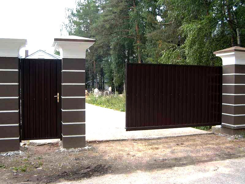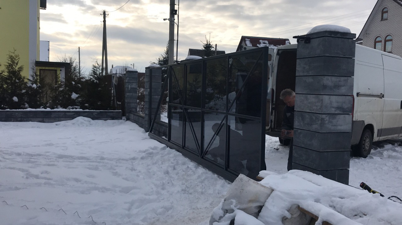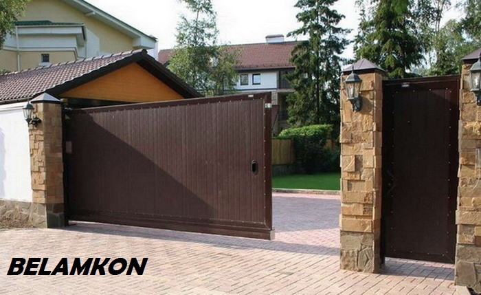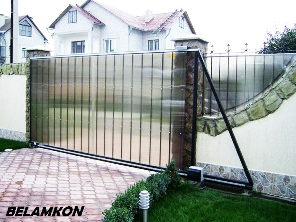 Заполнение ворот на выбор: профнастил/евроштакетник/стекло/жалюзи/поликарбонат. Возможны элементы ковки.