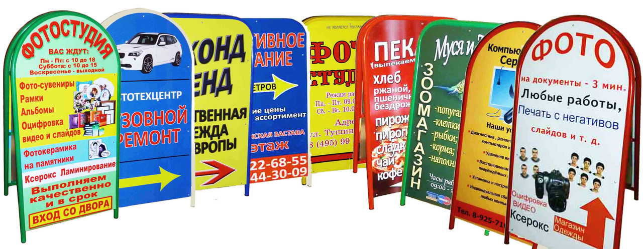 Штендеры — мобильные конструкции, часто встречающиеся на тротуарах, у входов в магазины, кафе, салоны красоты и другие заведения. Они представляют собой складные или стационарные рекламные щиты, на которых размещают информацию о текущих акциях, скидках, меню заведения или графике работы. Главное преимущество штендеров — возможность быстро менять рекламное сообщение и удобство в эксплуатации.